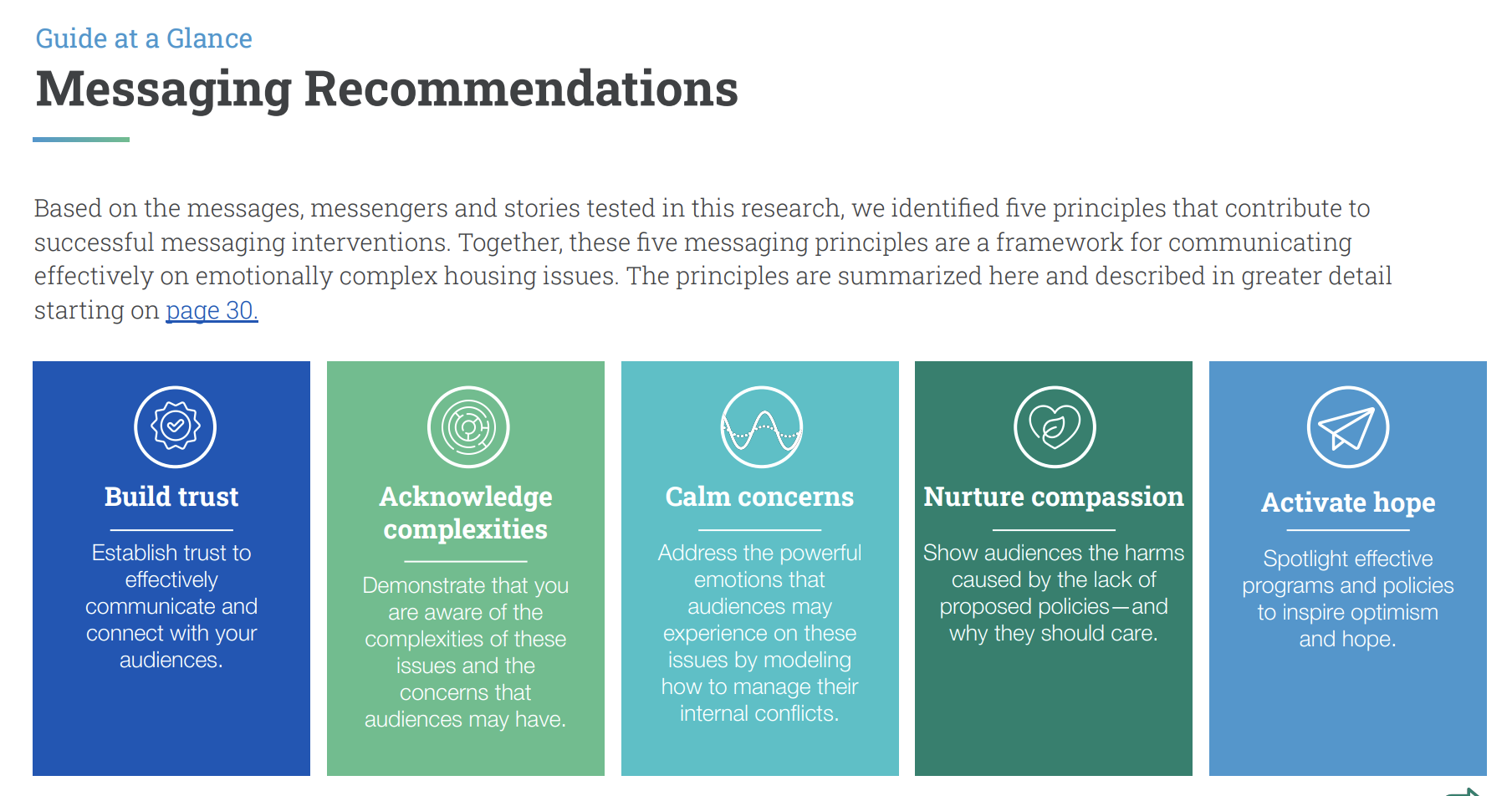 Activate hope – spotlight effective programs and policies to inspire optimism and hope. Highlight real-world stories, mix personal stories with facts of impact, don't overstate, and end the message on a positive note.